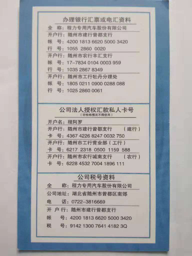 在此附上湖北程力公司財務帳號信息,望廣大購車用戶打款請打湖北程力財務對公帳號,以免上當受騙!