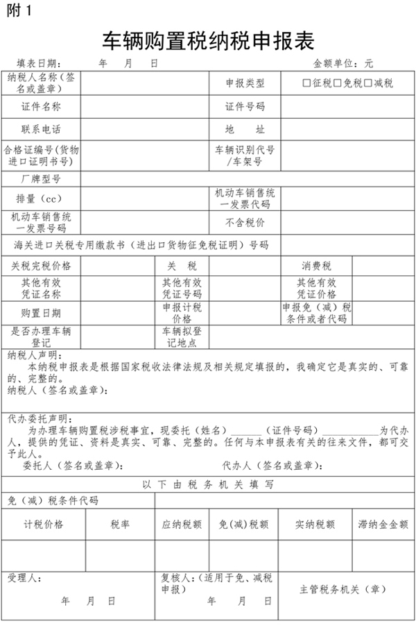 《車(chē)輛購(gòu)置稅納稅申報(bào)表》填表說(shuō)明 1.本表由車(chē)輛購(gòu)置稅納稅人在辦理納(免、減)稅申報(bào)時(shí)填寫(xiě)(打印),由納稅人簽章確認(rèn)。 2.“納稅人名稱(chēng)”欄,填寫(xiě)辦理申報(bào)時(shí)提供的納稅人證件上注明的名稱(chēng)。 3.“證件名稱(chēng)”欄,單位納稅人填寫(xiě)《統(tǒng)一社會(huì)信用代碼證書(shū)》或者《營(yíng)業(yè)執(zhí)照》或者其他有效機(jī)構(gòu)證明;個(gè)人納稅人填寫(xiě)《居民身份證》或者其他身份證明名稱(chēng)。 4.“證件號(hào)碼”欄,填寫(xiě)“證件名稱(chēng)”欄填寫(xiě)的證件的號(hào)碼。 5.“合格證編號(hào)(貨物進(jìn)口證明書(shū)號(hào))”“車(chē)輛識(shí)別代號(hào)/車(chē)架號(hào)”“廠(chǎng)牌型號(hào)”“排量(cc)”欄,分別按照車(chē)輛合格證或者《中華人民共和國(guó)海關(guān)貨物進(jìn)口證明書(shū)》或者《中華人民共和國(guó)海關(guān)監(jiān)管車(chē)輛進(jìn)(出)境領(lǐng)(銷(xiāo))牌照通知書(shū)》或者《沒(méi)收走私汽車(chē)、摩托車(chē)證明書(shū)》中對(duì)應(yīng)的編號(hào)、車(chē)輛識(shí)別代號(hào)/車(chē)架號(hào)、車(chē)輛品牌和車(chē)輛型號(hào)、排量填寫(xiě)。 6.“機(jī)動(dòng)車(chē)銷(xiāo)售統(tǒng)一發(fā)票代碼”“機(jī)動(dòng)車(chē)銷(xiāo)售統(tǒng)一發(fā)票號(hào)碼”“不含稅價(jià)”欄,分別按照機(jī)動(dòng)車(chē)銷(xiāo)售統(tǒng)一發(fā)票相應(yīng)項(xiàng)目填寫(xiě)。 7.下列欄次由進(jìn)口自用車(chē)輛的納稅人填寫(xiě): (1)“海關(guān)進(jìn)口關(guān)稅專(zhuān)用繳款書(shū)(進(jìn)出口貨物征免稅證明)號(hào)碼”欄,填寫(xiě)《海關(guān)進(jìn)口關(guān)稅專(zhuān)用繳款書(shū)》中注明的號(hào)碼;免征關(guān)稅應(yīng)稅車(chē)輛填寫(xiě)《進(jìn)出口貨物征免稅證明》中注明的編號(hào)。 (2)“關(guān)稅完稅價(jià)格”欄,通過(guò)《海關(guān)進(jìn)口關(guān)稅專(zhuān)用繳款書(shū)》《海關(guān)進(jìn)口消費(fèi)稅專(zhuān)用繳款書(shū)》《海關(guān)進(jìn)口增值稅專(zhuān)用繳款書(shū)》或者其他資料進(jìn)行采集,順序如下: ①《海關(guān)進(jìn)口關(guān)稅專(zhuān)用繳款書(shū)》中注明的關(guān)稅完稅價(jià)格; ② 在免關(guān)稅的情況下,通過(guò)《海關(guān)進(jìn)口消費(fèi)稅專(zhuān)用繳款書(shū)》中注明的完稅價(jià)格和消費(fèi)稅稅額計(jì)算關(guān)稅完稅價(jià)格; ③ 在免關(guān)稅和免或者不征消費(fèi)稅的情況下,采用《海關(guān)進(jìn)口增值稅專(zhuān)用繳款書(shū)》中注明的完稅價(jià)格; ④ 在關(guān)稅、消費(fèi)稅和增值稅均免征或者不征的情況下,通過(guò)其他資料采集關(guān)稅完稅價(jià)格。 (3)“關(guān)稅”欄,填寫(xiě)《海關(guān)進(jìn)口關(guān)稅專(zhuān)用繳款書(shū)》中注明的關(guān)稅稅額。 (4)“消費(fèi)稅”欄,填寫(xiě)《海關(guān)進(jìn)口消費(fèi)稅專(zhuān)用繳款書(shū)》中注明的消費(fèi)稅稅額。 8.“其它有效憑證名稱(chēng)”“其它有效憑證號(hào)碼”“其它有效憑證價(jià)格”欄由未取得機(jī)動(dòng)車(chē)銷(xiāo)售統(tǒng)一發(fā)票且非進(jìn)口自用的納稅人按取得的相應(yīng)證明資料內(nèi)容填寫(xiě)。 9.“購(gòu)置日期”欄,填寫(xiě)機(jī)動(dòng)車(chē)銷(xiāo)售統(tǒng)一發(fā)票或者海關(guān)進(jìn)口關(guān)稅專(zhuān)用繳款書(shū)(進(jìn)出口貨物征免稅證明)或者其他有效憑證的開(kāi)具或者生效日期。 10.“申報(bào)計(jì)稅價(jià)格”欄,分別按照下列要求填寫(xiě): (1)境內(nèi)購(gòu)置車(chē)輛,按照車(chē)輛相關(guān)憑證的不含稅價(jià)填寫(xiě); (2)進(jìn)口自用車(chē)輛,按計(jì)稅價(jià)格填寫(xiě),計(jì)稅價(jià)格=關(guān)稅完稅價(jià)格+關(guān)稅+消費(fèi)稅; 11.“申報(bào)免(減)稅條件或者代碼”欄,分別按照下列情形填寫(xiě)文字或者代碼: A.外國(guó)駐華使館、領(lǐng)事館和國(guó)際組織駐華機(jī)構(gòu)及其有關(guān)人員自用的車(chē)輛,免稅; B.中國(guó)人民解放軍和中國(guó)人民武裝警察部隊(duì)列入裝備訂貨計(jì)劃的車(chē)輛,免稅; C.懸掛應(yīng)急救援專(zhuān)用號(hào)牌的國(guó)家綜合性消防救援車(chē)輛,免稅; D.設(shè)有固定裝置的非運(yùn)輸專(zhuān)用作業(yè)車(chē)輛,免稅; E.城市公交企業(yè)購(gòu)置的公共汽電車(chē)輛,免稅; F.國(guó)務(wù)院規(guī)定予以免稅或者減稅的其他情形的,按照規(guī)定免稅或者減稅。 12.“是否辦理車(chē)輛登記”欄,如填寫(xiě)“是”,則“車(chē)輛擬登記地點(diǎn)”欄應(yīng)填寫(xiě)具體縣(市、區(qū))。 13.本表一式二份(一車(chē)一表),一份由納稅人留存,一份由主管稅務(wù)機(jī)關(guān)留存。