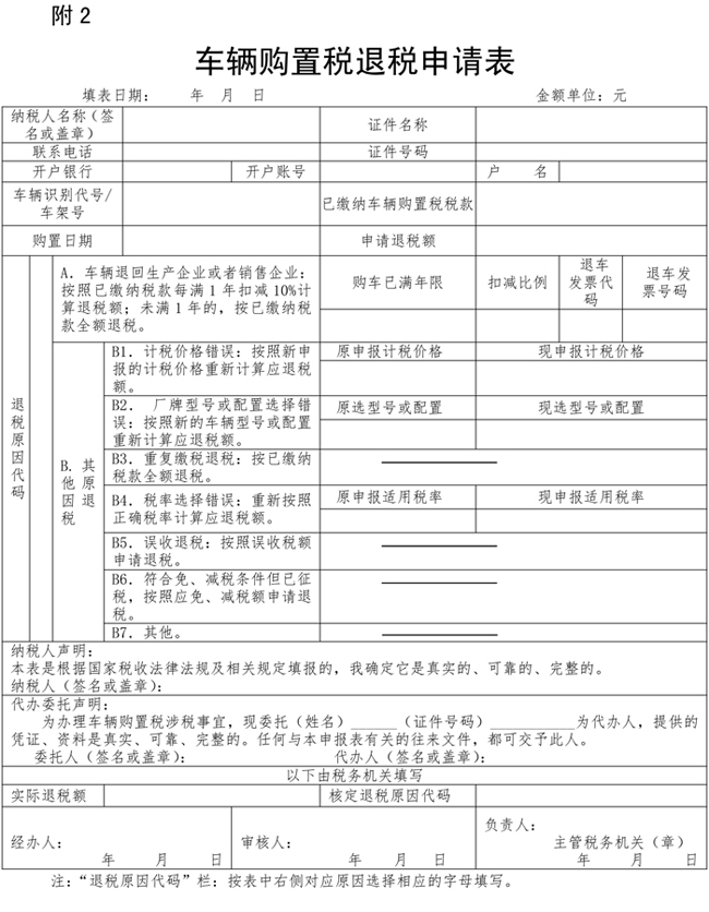 《車(chē)輛購(gòu)置稅退稅申請(qǐng)表》填表說(shuō)明 1.本表由車(chē)輛購(gòu)置稅納稅人在辦理退稅申請(qǐng)時(shí)填寫(xiě)(打印),由納稅人簽章確認(rèn)。 2.“納稅人名稱(chēng)”欄,填寫(xiě)辦理退稅申報(bào)時(shí)提供的納稅人證件上注明的名稱(chēng)。 3.“證件名稱(chēng)”欄,單位納稅人填寫(xiě)《統(tǒng)一社會(huì)信用代碼證書(shū)》或者《營(yíng)業(yè)執(zhí)照》或者其他有效機(jī)構(gòu)證明;個(gè)人納稅人填寫(xiě)《居民身份證》或者其他身份證明名稱(chēng)。 4.“證件號(hào)碼”欄,填寫(xiě)“證件名稱(chēng)”欄填寫(xiě)的證件的號(hào)碼。 5.“開(kāi)戶(hù)銀行”“賬號(hào)”“戶(hù)名”欄,填寫(xiě)納稅人用來(lái)接收國(guó)庫(kù)退稅稅款的開(kāi)戶(hù)銀行、賬號(hào)及開(kāi)戶(hù)名稱(chēng)。 6.“車(chē)輛識(shí)別代號(hào)/車(chē)架號(hào)”欄,按車(chē)輛合格證或者《中華人民共和國(guó)海關(guān)貨物進(jìn)口證明書(shū)》或者《中華人民共和國(guó)海關(guān)監(jiān)管車(chē)輛進(jìn)(出)境領(lǐng)(銷(xiāo))牌照通知書(shū)》或者《沒(méi)收走私汽車(chē)、摩托車(chē)證明書(shū)》中對(duì)應(yīng)的車(chē)輛識(shí)別代號(hào)(車(chē)架號(hào))填寫(xiě)。 7.“已繳納車(chē)輛購(gòu)置稅稅款”欄,填寫(xiě)主管稅務(wù)機(jī)關(guān)開(kāi)具的車(chē)輛購(gòu)置稅繳稅憑證上注明的繳稅金額。 8.“購(gòu)置日期”欄,填寫(xiě)機(jī)動(dòng)車(chē)銷(xiāo)售統(tǒng)一發(fā)票(或者有效憑證)上注明的開(kāi)票日期。 9.“申請(qǐng)退稅額”欄,填寫(xiě)納稅人向稅務(wù)機(jī)關(guān)申請(qǐng)的退稅金額。 10.“退稅原因代碼”欄,按表中右側(cè)對(duì)應(yīng)原因選擇相應(yīng)的字母填寫(xiě)。 11.本表(一車(chē)一表)一式三份,一份由納稅人留存;一份由國(guó)庫(kù)留存;一份由主管稅務(wù)機(jī)關(guān)留存。