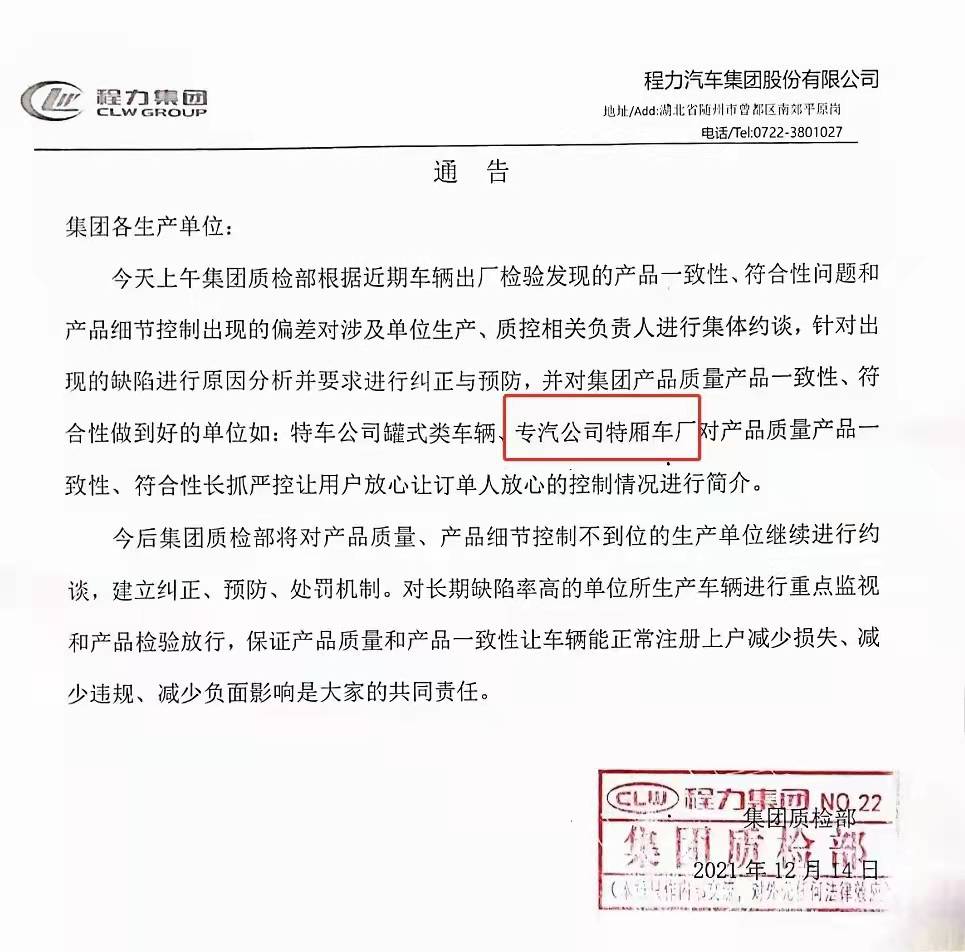程力集團(tuán)質(zhì)檢部對(duì)湖北程力汽車亂象不一致性作出糾正處罰預(yù)防機(jī)制