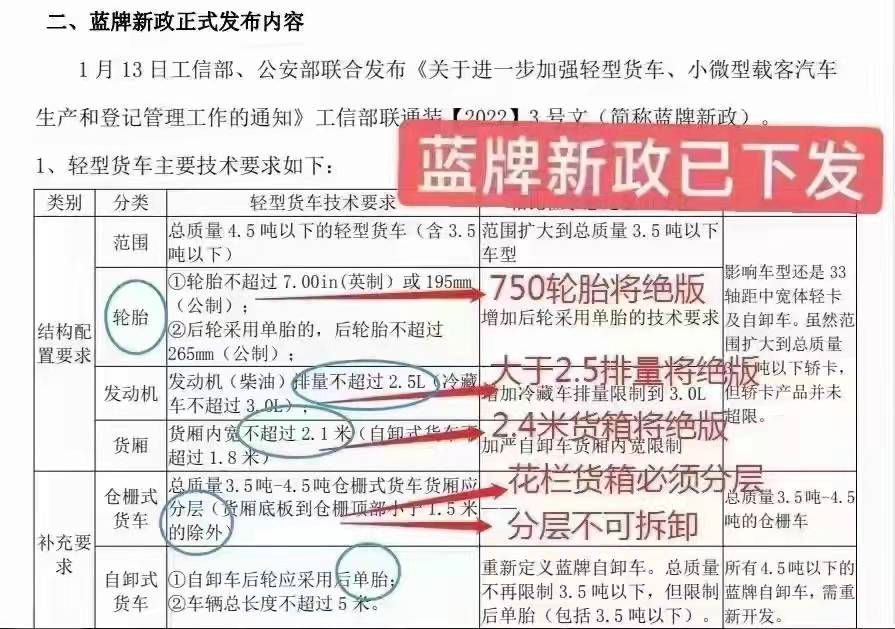 2022年藍(lán)牌專用汽車車輛上牌新規(guī)定解讀大噸小標(biāo)不可取。工業(yè)和信息化部 公安部關(guān)于進(jìn)一步加強(qiáng)輕型貨車、小微型載客汽車生產(chǎn)和登記管理工作的通知:近年來,輕型貨車“大噸小標(biāo)”、小微型載客汽車違法載人載貨引發(fā)的道路交通事故多發(fā),給人民群眾生命財(cái)產(chǎn)安全造成重大損失,成為嚴(yán)重道路交通安全隱患。為貫徹落實(shí)《全國安全生產(chǎn)專項(xiàng)整治三年行動(dòng)計(jì)劃》和《道路運(yùn)輸安全專項(xiàng)整治三年行動(dòng)實(shí)施方案》要求,切實(shí)加強(qiáng)車輛生產(chǎn)和登記管理,進(jìn)一步提高輕型貨車、小微型載客汽車安全技術(shù)性能,現(xiàn)將有關(guān)事項(xiàng)通知如下: 一、提高輕型貨車、小微型載客汽車安全技術(shù)要求 (一)為從產(chǎn)品源頭有效消除輕型貨車“大噸小標(biāo)”、超載運(yùn)輸隱患,遏制小微型載客汽車非法改裝行為,自本通知發(fā)布之日起,新申報(bào)《道路機(jī)動(dòng)車輛生產(chǎn)企業(yè)及產(chǎn)品公告》(以下簡稱《公告》)的輕型貨車產(chǎn)品應(yīng)當(dāng)增加貨廂材質(zhì)、厚度、重量等參數(shù)信息,小微型載客汽車產(chǎn)品應(yīng)當(dāng)增加座椅布置、固定方式等參數(shù)信息。新申報(bào)產(chǎn)品及已列入《公告》的在產(chǎn)產(chǎn)品,除需符合國家有關(guān)政策和強(qiáng)制性標(biāo)準(zhǔn)要求外,還需滿足本通知附件《輕型貨車、小微型載客汽車安全技術(shù)規(guī)范》(以下簡稱《技術(shù)規(guī)范》)規(guī)定要求。不符合本通知《技術(shù)規(guī)范》要求的新產(chǎn)品,工業(yè)和信息化部將不予公告。 (二)不符合本通知《技術(shù)規(guī)范》要求的在產(chǎn)產(chǎn)品,2022年3月1日起,生產(chǎn)企業(yè)應(yīng)立即停止生產(chǎn),相關(guān)機(jī)構(gòu)應(yīng)立即停止接收相關(guān)產(chǎn)品合格證信息;其中,對(duì)已列入《公告》的排量大于2.5升但符合本通知其他要求的輕型貨車在產(chǎn)產(chǎn)品,給予生產(chǎn)銷售過渡期6個(gè)月,過渡期滿后,生產(chǎn)企業(yè)應(yīng)立即停止生產(chǎn),相關(guān)機(jī)構(gòu)應(yīng)立即停止接收相關(guān)產(chǎn)品合格證信息。 (三)對(duì)2022年3月1日前已生產(chǎn)并已上傳合格證、但不符合本通知《技術(shù)規(guī)范》要求的庫存產(chǎn)品,生產(chǎn)企業(yè)可向工業(yè)和信息化部提出庫存延期銷售申請(qǐng),并隨附庫存清單以及生產(chǎn)企業(yè)關(guān)于該型產(chǎn)品無“大噸小標(biāo)”等違規(guī)情況、自愿承擔(dān)相關(guān)法律責(zé)任的書面材料,經(jīng)履行核實(shí)、公示等相關(guān)程序,可給予6個(gè)月延期銷售、注冊(cè)登記期限。根據(jù)道路運(yùn)輸安全專項(xiàng)整治行動(dòng)進(jìn)展的具體情況,工業(yè)和信息化部、公安部將適時(shí)修訂完善《技術(shù)規(guī)范》。 二、落實(shí)生產(chǎn)企業(yè)產(chǎn)品安全質(zhì)量、生產(chǎn)一致性主體責(zé)任 (四)生產(chǎn)企業(yè)應(yīng)當(dāng)提高安全責(zé)任和風(fēng)險(xiǎn)防控意識(shí),嚴(yán)格落實(shí)產(chǎn)品安全質(zhì)量、生產(chǎn)一致性主體責(zé)任,合法守信進(jìn)行生產(chǎn)經(jīng)營,健全相關(guān)管理制度,加強(qiáng)車輛產(chǎn)品出廠前安全質(zhì)量檢驗(yàn),確保批產(chǎn)產(chǎn)品符合國家強(qiáng)制性標(biāo)準(zhǔn)和有關(guān)規(guī)定要求,確保批產(chǎn)產(chǎn)品與公告型式批準(zhǔn)車型規(guī)格參數(shù)一致,切實(shí)提高車輛產(chǎn)品安全性能。 (五)采用委改方式生產(chǎn)的貨車整車生產(chǎn)企業(yè)承擔(dān)委改產(chǎn)品安全質(zhì)量、生產(chǎn)一致性完全責(zé)任,要制定辦法對(duì)委改企業(yè)加強(qiáng)管理,對(duì)委托改裝車輛產(chǎn)品實(shí)施質(zhì)量控制和生產(chǎn)一致性管理,保證委改產(chǎn)品參數(shù)與許可參數(shù)一致。 (六)生產(chǎn)企業(yè)應(yīng)加強(qiáng)對(duì)機(jī)動(dòng)車整車出廠合格證管理,在機(jī)動(dòng)車制造完畢且檢驗(yàn)合格后實(shí)時(shí)填報(bào)、傳送合格證電子信息,合格證載明的信息應(yīng)當(dāng)與《公告》產(chǎn)品技術(shù)參數(shù)以及產(chǎn)品實(shí)際技術(shù)參數(shù)一致,不得銷售尚未傳送合格證電子信息的機(jī)動(dòng)車,嚴(yán)禁上傳未生產(chǎn)下線機(jī)動(dòng)車整車合格證電子信息。嚴(yán)禁為同一機(jī)動(dòng)車配發(fā)不同《公告》型號(hào)的機(jī)動(dòng)車整車出廠合格證,嚴(yán)禁對(duì)檢驗(yàn)不合格、不符合生產(chǎn)一致性要求的車輛出具整車出廠合格證明。對(duì)不符合本通知要求的已公告產(chǎn)品,生產(chǎn)企業(yè)應(yīng)組織進(jìn)行設(shè)計(jì)整改,經(jīng)整改確認(rèn)符合要求的,可恢復(fù)其產(chǎn)品生產(chǎn)及合格證傳送。 三、嚴(yán)把車輛產(chǎn)品檢驗(yàn)機(jī)構(gòu)產(chǎn)品檢測關(guān) (七)承擔(dān)《公告》車輛產(chǎn)品檢測工作的車輛檢驗(yàn)機(jī)構(gòu)要嚴(yán)把產(chǎn)品檢測關(guān),在對(duì)申報(bào)《公告》的樣車進(jìn)行檢驗(yàn)時(shí),嚴(yán)格按照國家標(biāo)準(zhǔn)和有關(guān)規(guī)定進(jìn)行,不得減少檢驗(yàn)項(xiàng)目,不得降低檢驗(yàn)