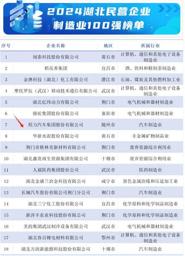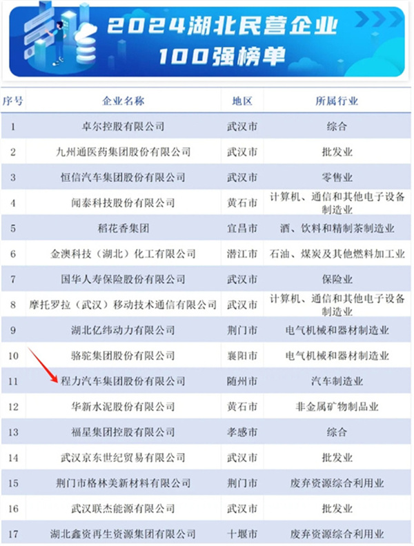 導讀:今天(10月31日)湖北省工商業聯合會發布2024湖北民營企業百強系列榜單這是湖北連續14年發布民企百強榜單,湖北發布2024湖北民營企業百強榜單,程力汽車集團位列…