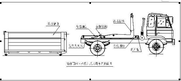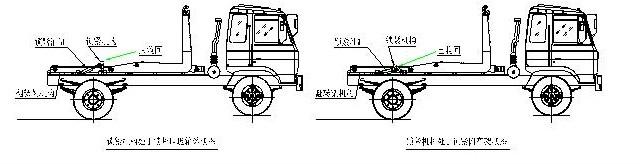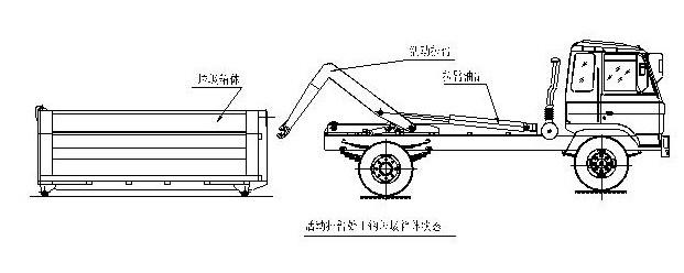 拉臂式垃圾車(車廂可卸式垃圾車)使用說明 一、概述 什么是勾臂垃圾車? 車廂可卸式垃圾車又稱拉臂式垃圾車(以下簡稱垃圾車)是用于城鎮(zhèn)袋裝、散裝生活垃圾物的收集、運輸、卸料作業(yè)的專用車輛。 該車是由汽車底盤、拉臂主油缸、附車架、翻轉架、支撐腿(選裝)、鎖緊架、鎖緊油缸及多路換向閥等組成。翻轉架一端連在附車架上,其另一端設有活動拉臂,中間安裝有鎖緊系統;活動臂油缸一端連在活動臂上,另一端連接在附車架上;鎖緊機構通過鎖緊油缸的動作可以在箱體自卸時將附車架上的箱體與翻轉架及拉臂連為一體,在主油缸伸出時形成自卸角,也可以通過鎖緊油缸的收回把翻轉架與附車架鎖緊為一體,利用主油缸的收回或伸出使活動拉臂將地下的垃圾箱拖拉至附車架上或從附車架上放回到地面。 該車可將地下垃圾箱內的垃圾及垃圾箱一同拉至車上運走同時可自卸,降低了工人的勞動強度。該垃圾車的收運方式是目前世界上廣泛采用的垃圾收運方式,可以實現一車多箱,大大降低了配備成本和空間等等;其專用裝置的功能均以汽車發(fā)動機為動力,通過液壓機構手動或電控來實現。車輛的箱體采用優(yōu)質炭鋼板全密封焊接結構,具有強度高、重量輕、不產生二次污染等優(yōu)點。 二、結構簡圖 三、操作步驟 在裝載垃圾前,空載運轉達到6個標準氣壓時,掛上取力器(駕駛室內方向盤左下方),檢查各部件有無泄漏或異常后,再按照操作指示牌指示位置進行操作;其具體操作步驟如下: 拉起垃圾箱體 步驟1.將鎖緊鉤操作手柄推至收回位置,鎖緊油缸收回,使鎖緊架收回并將翻轉架與附車架鎖緊固定;如圖: 步驟2.將拉臂操作手柄拉起到伸起位置,拉臂油缸伸出,活動拉臂繞翻轉翻轉架前鉸鏈軸旋轉,拉臂處于鉤箱位置,適當調整拉臂鉤高度并與箱體彎鉤對準;如圖: