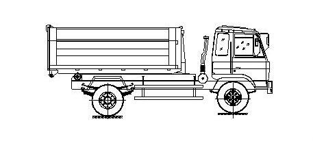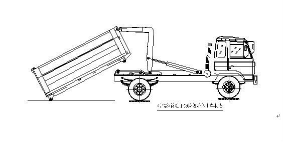 步驟3.當拉臂鉤鉤到箱體彎鉤時,繼續(xù)推下拉臂操作手柄到落下位置,使垃圾箱體繼續(xù)上車(注意:保證垃圾箱體的縱梁位于附車架尾部兩后滾輪之間);如圖: