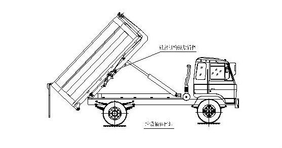 完成垃圾箱體的上車工作,松開取力器,整車可以運輸行駛。 步驟5. 在卸垃圾前,整車運轉達到6個標準氣壓時掛上取力器,打開垃圾箱后門鎖緊裝置,在前級二聯多路閥處,首先確定鎖緊架鎖緊垃圾箱體(拉起鎖緊鉤操作手柄至鎖緊位置),然后拉起拉臂操作手柄至伸出位置,垃圾箱體備傾斜舉起垃圾卸出;如圖: