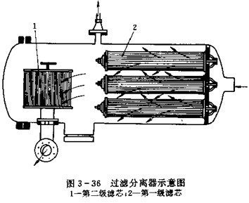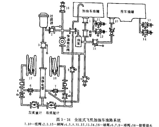 飛機(jī)加油車 (1)飛機(jī)加油的特殊要求,飛機(jī)加油車在總體上與普通加油車基本相同,但結(jié)構(gòu)上還有特殊要求。 ①加油壓力穩(wěn)定性要求高,為此在加油管路上加裝壓力調(diào)節(jié)器,穩(wěn)壓器和壓力加油接冰在。 ②油料的潔凈度高。油路上要用高性能的過濾分離器。罐體和管道必須采用鋁合金制造。 ③絕對(duì)保證加油安全性。應(yīng)安裝消靜電裝置,聯(lián)鎖控制系統(tǒng)、電氣防爆器、滅火器等。 ④裝有高精度,大流量的計(jì)量器。 ⑤油罐總?cè)萘看螅o飛機(jī)加油要一次完成。 (2)飛機(jī)加油車特殊要求的主要部件 ①旁通穩(wěn)壓閥。給飛機(jī)加油,一般采取底部閉式加油,要求加油車具有穩(wěn)定的管端壓力,通常為0.343MPa,而對(duì)車輛加油則不要求管端壓力。一般在油泵上并聯(lián)旁穩(wěn)壓閥,在絞盤后的出油管路上串聯(lián)壓力補(bǔ)償器。圖3-34為全掛式飛機(jī)加油車油路系統(tǒng)圖,油泵上并聯(lián)有旁通穩(wěn)壓閥,其調(diào)定壓力為油泵的工作壓力,由管端壓力和管路的壓力損失確定。圖3-35 為旁通穩(wěn)壓閥的工作原理圖。氣室1內(nèi)充有一定壓力的空氣,上部油室2與泵的出口高壓油相通,氣室活塞3、油室活塞4與閥門5連成一體。在泵正常工用壓力下,氣室的氣體對(duì)活塞3的推力F1與油室油液對(duì)活塞4的推力F2相等,閥門5關(guān)閉不動(dòng),當(dāng)泵出口壓力升高時(shí),油室的壓力隨之升高,F(xiàn)2> F1,活塞在力F=F2-F1的作用下推動(dòng)閥5下移,閥門被打開,泵的出口與入口油路接通,系統(tǒng)壓力被打開,泵的出口與入口油路接通,系統(tǒng)壓力開始下降,直至恢復(fù)原工作壓力,閥門又呈關(guān)閉狀態(tài)。 ②過濾分離器,為了獲得高潔凈度燃油,在管路中需加裝高性能的過濾分離器,將油中的水分,膠質(zhì)和雜質(zhì)分離出來,圖3-36為兩級(jí)過濾分離器。第一級(jí)濾芯2為聚結(jié)濾芯,由經(jīng)過特殊處理的濾紙或玻璃纖維,合成材料,毛氈、棉織品等制成。油流經(jīng)濾芯時(shí),首先濾出的固體物質(zhì),再將膠質(zhì)分離,同時(shí)將分離出的小水粒聚集成大水滴,落入由外殼形成的集水器中,第二級(jí)濾芯1為分離器濾芯,表面涂有聚四氟乙烯的表面滑下,滴入集水池中,達(dá)到徹底分離水的作用。