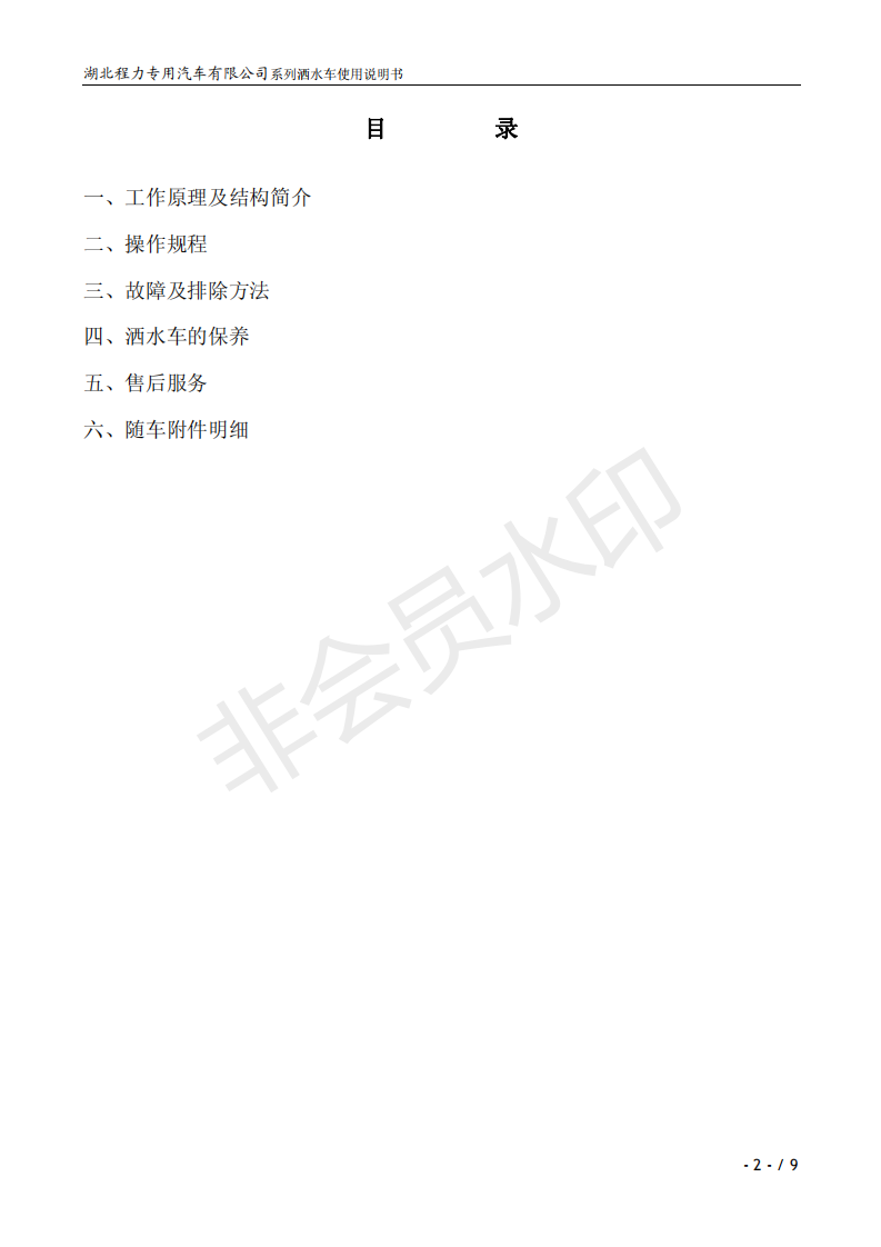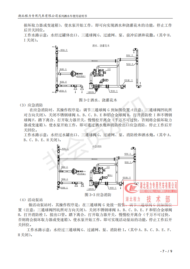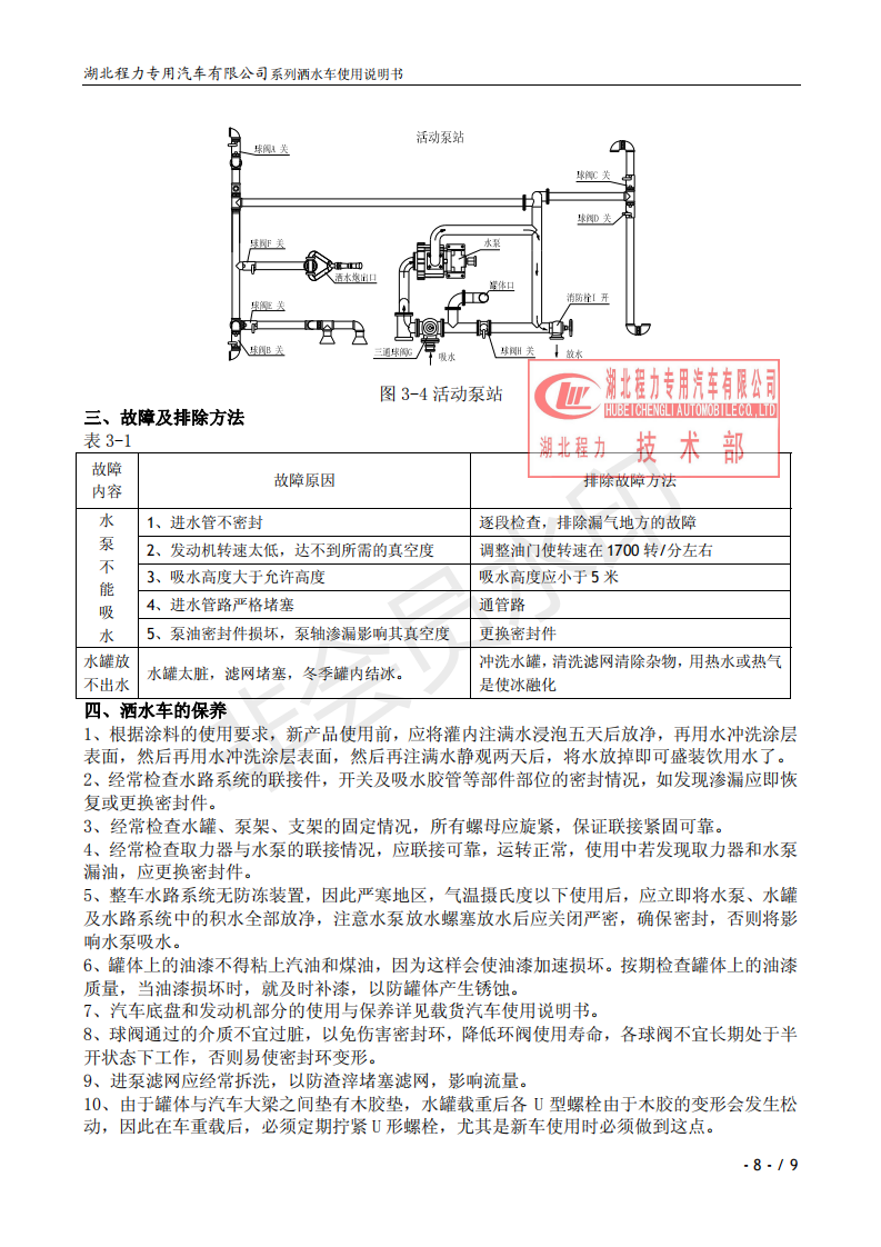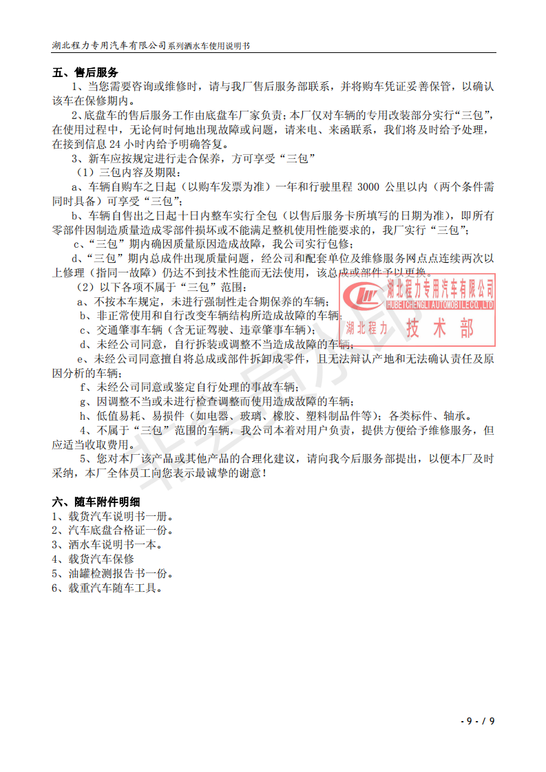 湖北程力專業生產東風小霸王灑水車、東風多利卡灑水車、東風灑水車、東風大金剛灑水車、東風140灑水車、東風140/47灑水車、東風145灑水車、東風153灑水車、東風1254灑水車、東風前四后八灑水車、東風天龍灑水車、半掛灑水車、解放系列灑水車、汽油灑水車等各類灑水車。用戶可自帶底盤我廠提供上裝部件的生產改裝。 灑水車前沖(噴)后灑,帶側噴,罐體后帶工作平臺,平臺上安裝綠化灑水炮,灑水炮可全方位旋轉,可連續調成直沖狀、大雨、小雨、毛毛雨,帶安全護欄,配備全國質量評比第一名的杭州威龍大功率專用灑水泵,泵可自吸自排,安裝過濾網,帶消防接口,可通過消防栓進水,帶自流閥,隨車選裝20米綠化卷盤,可噴灑農藥,罐體金屬漆。 灑水泵情況說明:大功率專用灑水泵,采用國際領先意大利技術,在國內生產各系列專用泵已有50年歷史,產品質量成熟可靠,設計先進合理,使用方便快捷,比同類灑水泵壓力大、吸程遠、使用壽命長,克服其它灑水泵易被雜物纏住、壓力小、吸水慢的缺點,引領國內外灑水泵行業標準,市場占有率93%。關于湖北程力灑水車使用說明書介紹如下,用戶不清楚可以直接打印出來。 ![]() ![]() ![]() ![]() ![]() ![]() ![]() ![]() ![]() |