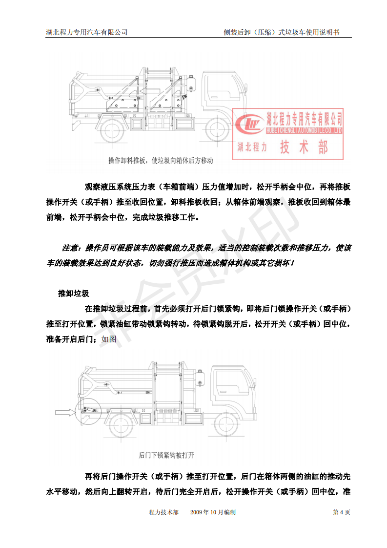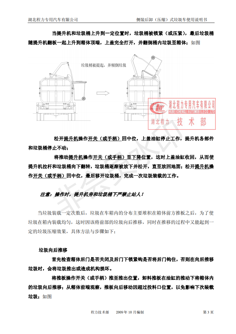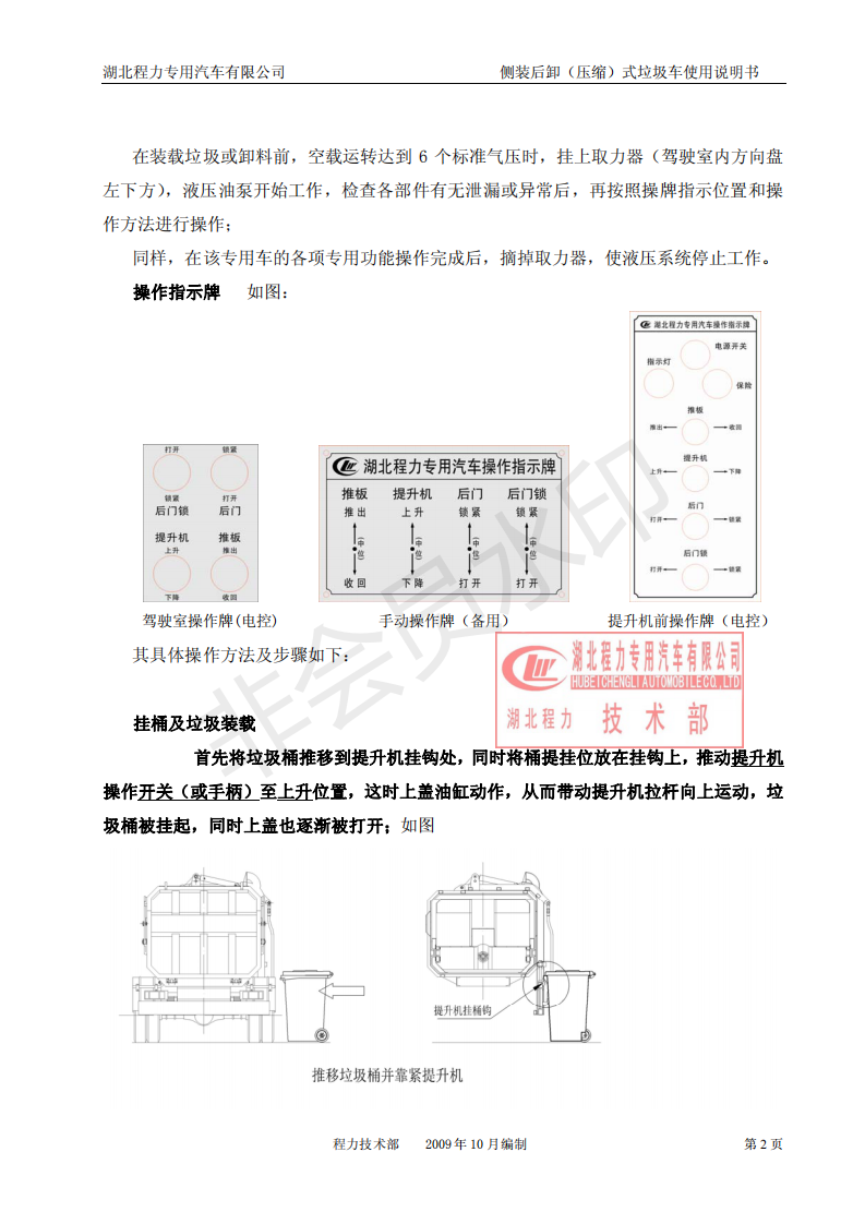 湖北程力側(cè)裝后卸(壓縮)式掛桶垃圾車使用說明書