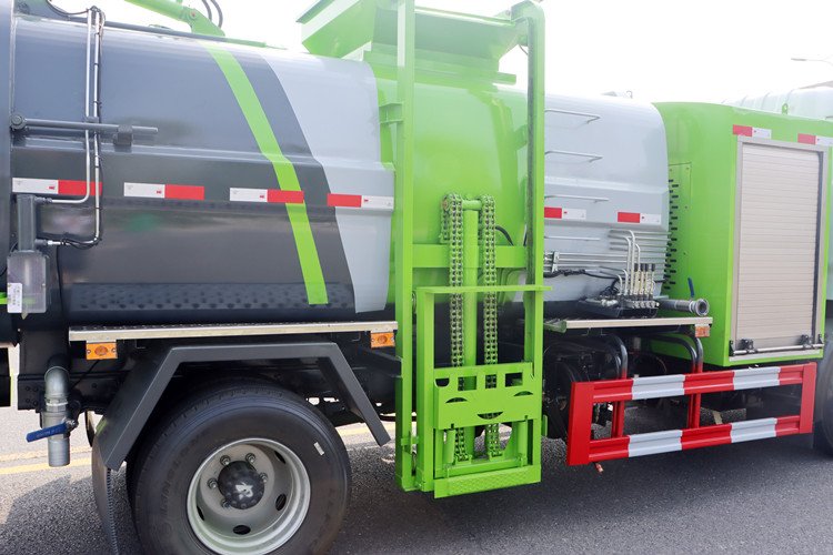 底盤電池提供動力,永磁同步電機驅動,可根據需要實時調速,取力操作與底盤行駛系統無任何關聯,用車體驗感極佳。程力牌東風凱普特新能源純電動5方餐廚垃圾車改裝配置:優質高強度 Q345 錳鋼制作無泄漏箱體,標配:1.弧形罐體,邊四底五/邊五底六。2.長源/皖液油泵,長源/中梅多路閥,知名液壓油缸。3.全推鏟卸料(不帶舉升功能),具有干濕分離功能。液壓后蓋,后蓋配防腐硅膠密封條。4.后門液壓鎖緊5.鏈條式提升機,可掛120/240升標準塑料垃圾桶。進料口蓋液壓開關。6.駕駛室內電控(提升機外部手動控制),后門鎖緊與后蓋開關的操作具有防誤操作。7.箱體帶清洗裝置(液壓馬達帶動高壓泵、帶水箱)。