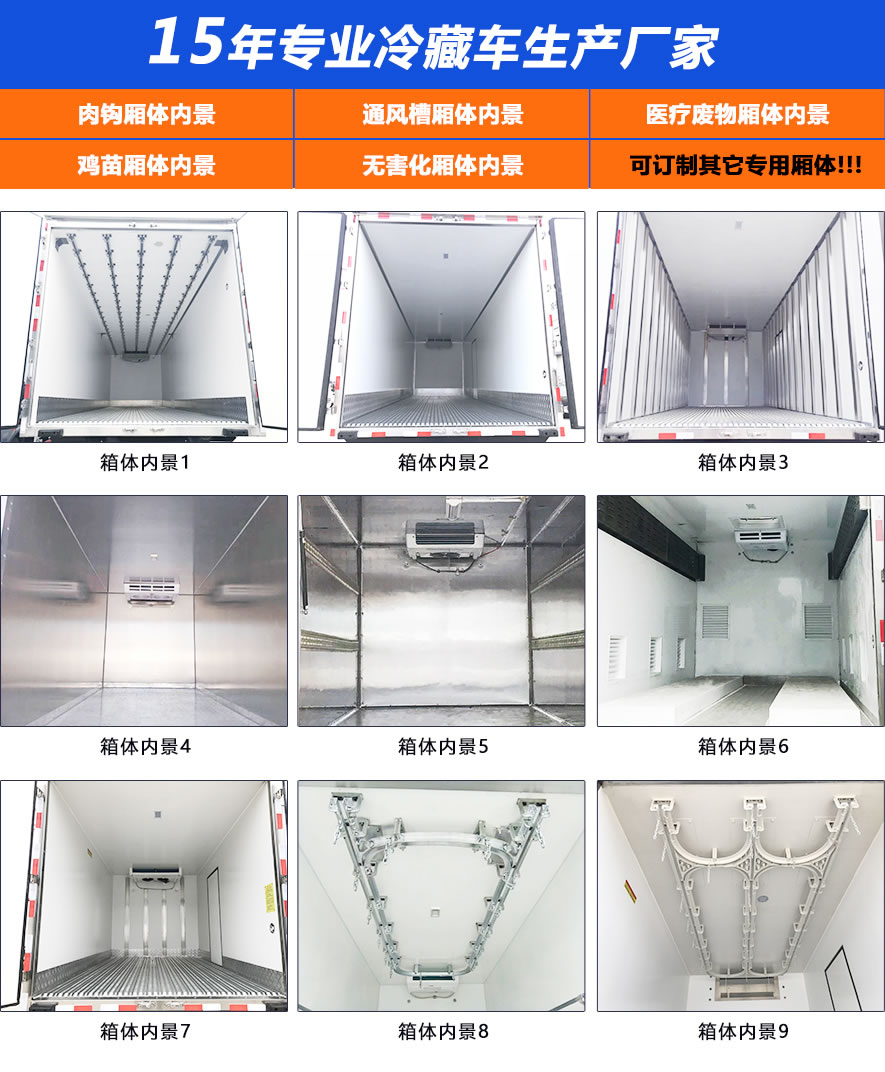 箱體采用三明治結(jié)構(gòu),內(nèi)外采用冷藏車專用玻璃鋼(可反射陽光可選用不銹鋼),中間保溫層采用聚氨酯發(fā)泡隔熱材料,18米罐注一次成型,產(chǎn)品重量輕,漏熱率(導(dǎo)熱系數(shù))低,強度高,保溫效果好,廂體美觀大方扎實耐用。廂體厚度8CM.廂體全為不銹鋼鎖件,鋁合金包角,廂體可選裝通風(fēng)槽、開側(cè)門等。根據(jù)需要可選裝配國內(nèi)外知名制冷機組(溫度達(dá)到保鮮或冷凍要求),可根據(jù)您的需求進(jìn)行定制生產(chǎn)。