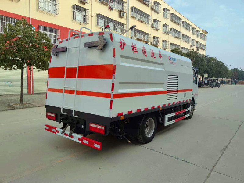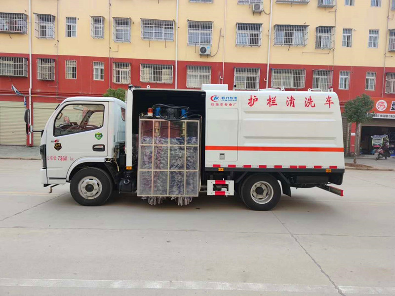 湖北程力國六東風多利卡城市護欄清洗車主要組成部分 電 氣 系 統 | 組 成 | 由底盤車電路和副發動機電氣部分及專用工作裝置操作控制電路組成。 | 底盤車系統電壓 | 12 V | 工作裝置系統電壓 | 12 V | 清 洗 裝 置 | 型式 | 在正副駕駛室后車架一側對稱布置4個清洗刷,由液壓馬達驅動,刷子升出后內外可液壓自動調節。 | 清洗刷直徑 | cm | φ50 | 清洗刷馬達轉速 | r/min | 300 | 單個清洗刷數量 | 55 | 清洗高度cm | 140-160 | 清洗原理 | 采用兩沖、四刷的清洗工藝,兩面同時清洗,使清洗更加徹底。清洗過程:首先刷輥前面的兩排噴水管噴出水將護欄充分預濕,車體前移的過程中,中間的兩排刷輥對護欄依次進行刷洗,最后由刷輥后面的兩排噴水管噴出水將殘留的灰塵沖去 |