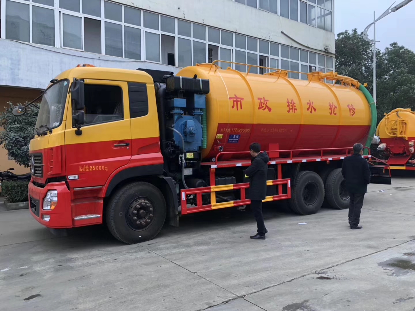 湖北程力東風(fēng)天龍后雙橋清洗帶吸污多功能聯(lián)合疏通車介紹: ✅ 底盤部分:東風(fēng)天龍后雙橋底盤,康明斯ISD270馬力,D901排半標(biāo)準(zhǔn)頂駕駛室,軸距4350+1350,法士特9JS119T-B變速箱,11.00R20 18PR輪胎,5.5噸前橋,雙10噸后橋(速比4.44),原廠空調(diào),ABS,調(diào)整臂,大燈調(diào)節(jié)。 ✳ 吸污部分:配濰柴375馬力30水環(huán)泵(或者濰柴420發(fā)動(dòng)機(jī)帶42水循環(huán)泵, 或者濰柴420發(fā)動(dòng)機(jī)帶252/253型號(hào)水環(huán)泵,價(jià)格有區(qū)別需要電議),加大防溢閥, ✳ 清洗裝置:配天津通潔300升高壓泵, 60米PVC雙層高壓管22通徑高壓管,10個(gè)高壓噴頭,兩個(gè)水泥蓋,頂部100的互通,水污互通用100的球閥。 水罐3寸球閥安在罐體最底部.水倉(cāng)污倉(cāng)罐體內(nèi)噴防銹,后封頭600的液壓口,一個(gè)6寸自流,一個(gè)4寸的進(jìn)料口,一個(gè)4寸的排污口,側(cè)面一個(gè)6寸的球閥偷排。后蓋加裝活動(dòng)可拆式卷盤壹套,右后側(cè)一套卷盤,罐體采用8個(gè)厚鋼板制作,后蓋上帶一個(gè)600液壓口排污,300側(cè)邊自流口。 湖北程力東風(fēng)天龍后雙橋清洗帶吸污多功能聯(lián)合疏通車公告參數(shù):